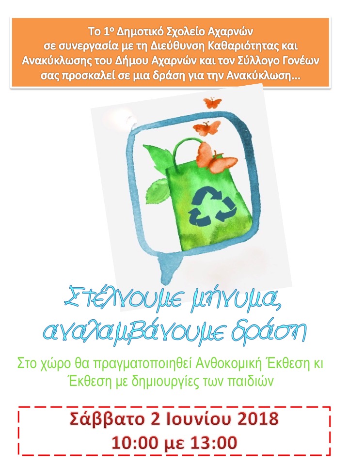 Μέχρι την Τετάρτη 14-06-2017 όσοι/ες επιθυμείτε μπορείτε να φέρετε τα υπόλοιπα βιβλία των παιδιών σας, που δεν επιθυμείτε να κρατήσετε, ώστε να δοθούν για ανακύκλωση σε μία προσπάθεια που έχει ήδη οργανώσει το σχολείο.
