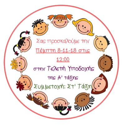 Σας προσκαλούμε την Τετάρτη 4 Δεκεμβρίου στις 12:00, στην αίθουσα πολλαπλών χρήσεων του σχολείου μας, στην τελετή υποδοχής της Α΄ τάξης.