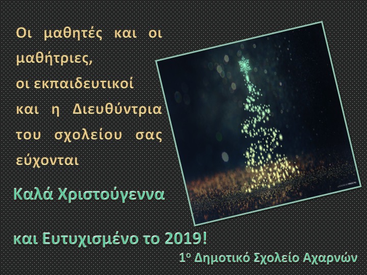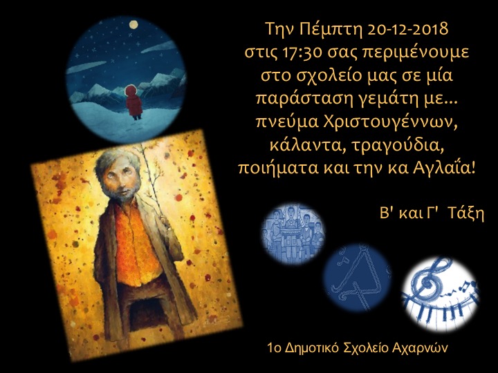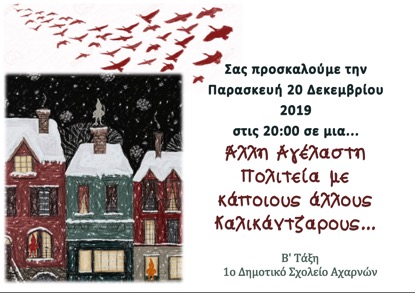 Σας προσκαλούμε στη χριστουγεννιάτικη γιορτή της Α΄τάξης του σχολείου μας την Παρασκευή 20 Δεκεμβρίου 2019 στις 17:30 στο χώρο του σχολείου μας.