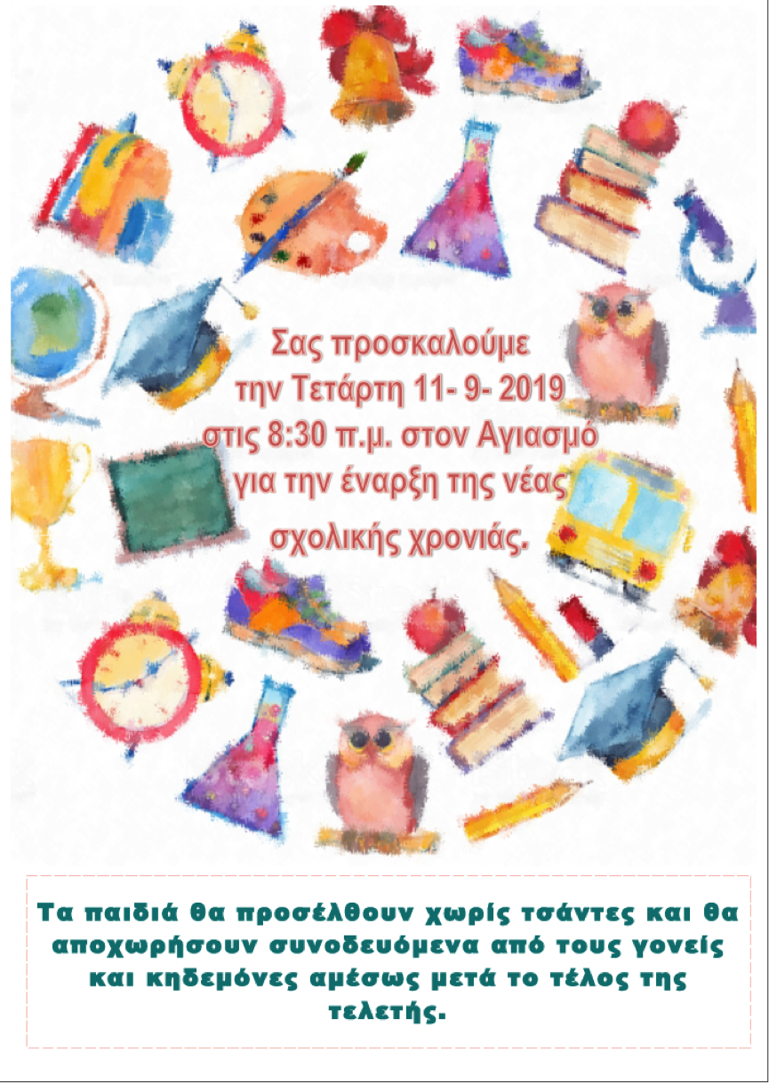 Τη Δευτέρα 11 Σεπτεμβρίου 2017 και ώρα 09:00 π. μ. θα πραγματοποιηθεί ο Αγιασμός στον προαύλιο χώρο του σχολείου.
